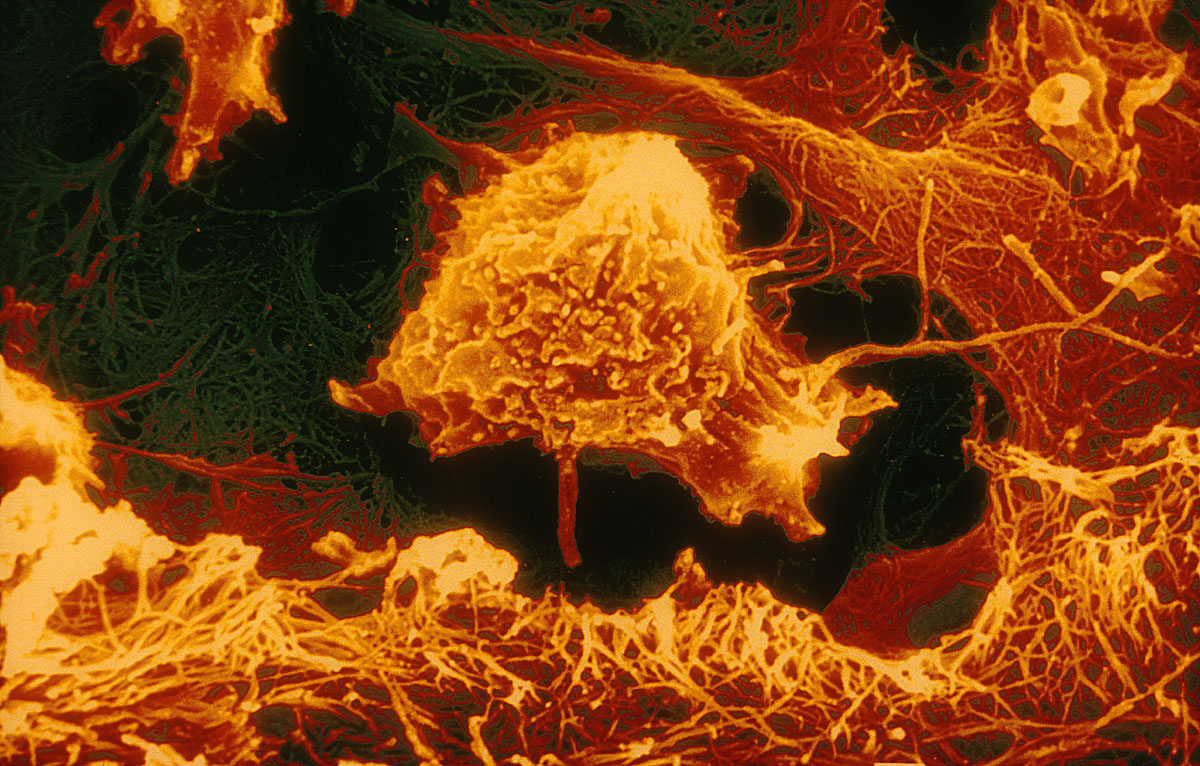 För att fånga upp enskilda sektioner skakas de ut på en vattenyta och får flyta omkring på ytspänningen. Därifrån kan man ta dem en och en och hasa upp på ett objektglas. SEM, svepelektronmikroskopVad är det vi ser? En bencell tagen ur den mänskliga benstommen med hjälp av biopsi. Hur har bilden och provet framställts? Biopsiprovet snittas i en mikrotom eller också delas provet på kryogenisk väg. Provet måste fixeras genom att man behandlar det så att all mjukvävnad försvinner. Cracking-metoden innebär att man fryser preparatet med kolsyreis eller flytande helium och sedan knackar till det med en hammare så att det spricker sönder. Det bevarar ytstrukturer väldigt bra.