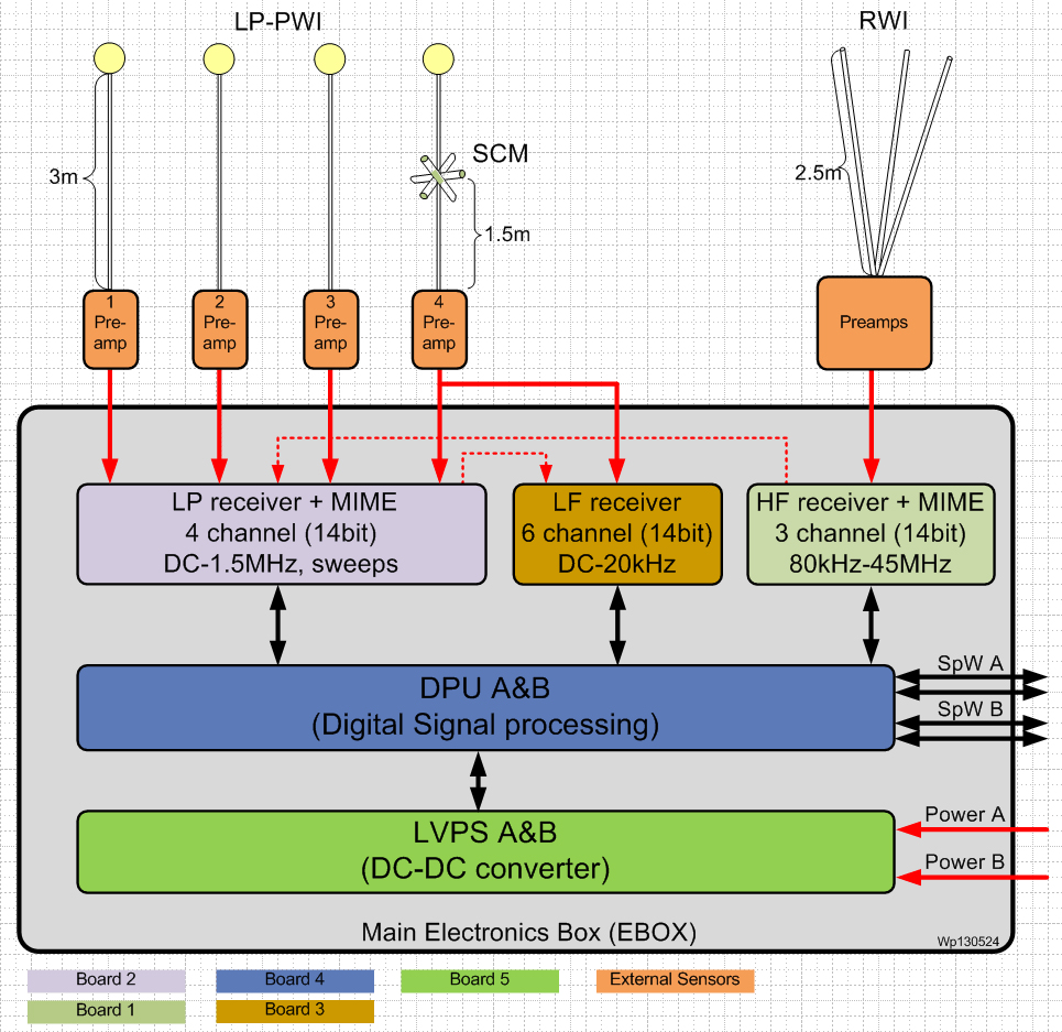Ett typiskt flygvärdigt kretskort avsett för Freja. Satellitelektronik ser inte alls ut som annan elektronik. Allting är fastlimmat med grön epoxi för att tåla vibrationerna vid starten. I övrigt ser du OP-förstärkare från Burr Brown, militärspecade TTL-kretsar i 54HC-serien från Texas Instruments och analoga kretsar från Analog Devices. Som synes är kortet inte särskilt modernt. Idag samlar man all den digitala elektroniken som sitter på detta kort i en enda FPGA. Än så länge kan man dock inte flytta in analog elektronik i stora samlingskretsar utan denna byggs fortfarande diskret. Det som visades i bilderna ovan som en hel mätlåda till Freja får idag rum på ett enda kretskort. Detta mätkort från 2013 kan bland annat driva tre langmuirprobar. Probarna kopplas in till höger och färdigt mätdata tas ut på en SpaceWire-kontakt upptill. Tidigare var all datakommunikation inom satelliter och rymdskepp punkt-till-punkt, men numera använder man en form av högsäkert datanät kallat SpaceWire, eller IEEE 1355. Nätet framförs på partvinnade ledningar, men till skillnad från exempelvis Ethernet använder man en klockpuls för att tala om när data finns att hämta. Till skillnad från läget i JUICE är förförstärkare och biaskontroll här monterat på samma kretskort som signalbehandling och kraftförsörjning. De tre probarna kan förses med lämpliga biasspänningar från switchaggregatets spänningsdubblarstege genom ett antal högspänningstransistorer som sitter vid varje kontaktdon. De spänningar och strömmar som kommer tillbaka från probarna förstärks av OP-förstärkarna som sitter intill. Notera att förstärkarkretsarna sitter på särskilda carriers, eftersom det inte är de slutliga flygvärdiga kretsarna vi ser, utan kommersiella versioner av dessa, som används vid provning. Den sålunda förstärkta mätspänningen analog-digitalomvandlas i den centrala processorkretsen, som dessutom hanterar all logik och all kommunikation med resten av rymdskeppets logik. Spänningsregulatorerna MSK 5910RH är linjära regulatorer som levererar stabiliserad spänning till logiken på kortet. De kan mata ut spänningar mellan 1,5-7 volt vid 5 ampere med typiskt 0,11 volt framspänningsfall. "RH" står för RadHard och kretsen klarar totalt 100 krad, vilket ger en uppfattning om vad kretskortet som helhet ska tåla i slutänden. Mätprobarnas praktiska konstruktionRymdfarkosten Rosetta gick i närkamp med kometen Churyamov-Gerasimenko år 2014. Det stora paradnumret blev landsättningen av landaren Philae, men förhoppningen om att dess harpun faktiskt skulle kunna få fäste i den enorma snöbollen, vars täthet man faktiskt inte känner, grusades. Philae studsade i den låga gravitationen och ramlade ned i ett hål. IRFs langmuirprobar och mätelektronik är betydligt anonymare, men lämnade lika betydelsefulla mätvärden som landarens kameror. Probarna sitter i detta fall på fasta armar och inte på trådbommar, för Rosetta spinner inte.